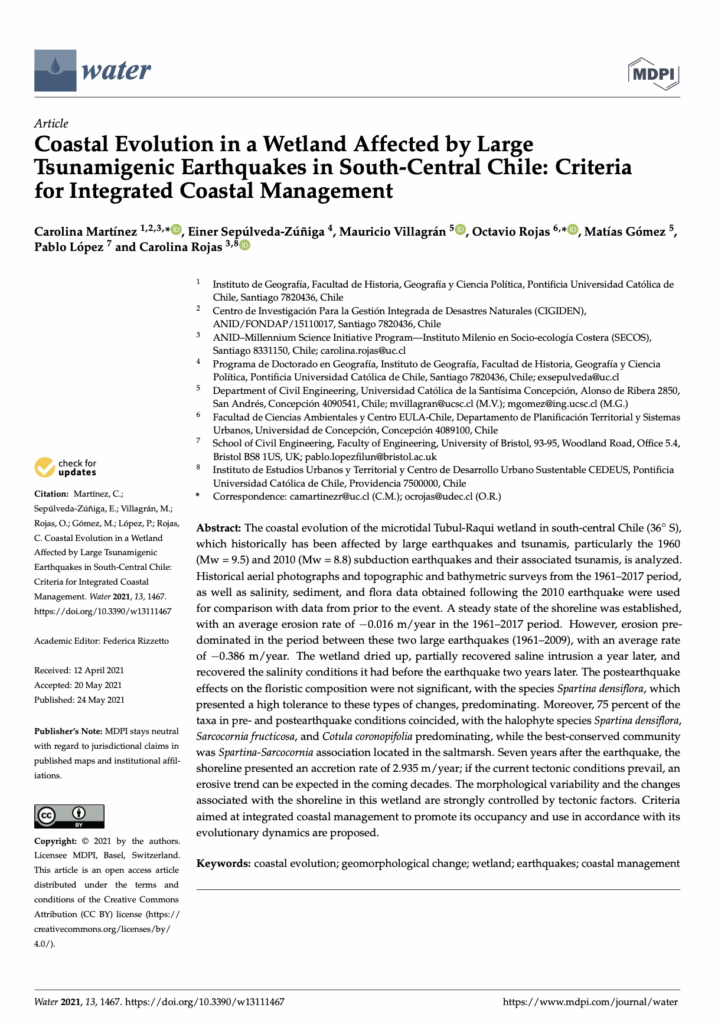 Se ha publicado un nuevo artículo sobre la evolución costera del humedal Tubul-Raqui, perturbado por el terremoto y tsunami de 2010. El artículo esta disponible en la revista Water y se puede consultar y descargar en el siguiente link Martínez,C.,Sepúlveda,E.,Villagrán,M.,Gómez,M., López,P.,Rojas,O., Rojas,C.(2021). Coastal Evolution in Wetland Affected by Large Tsunamigenic Earthquakes in South-Central Chile: Criteria […]