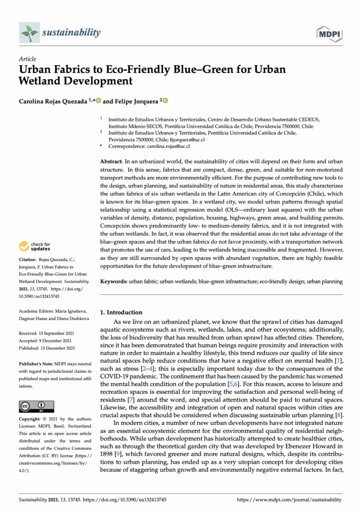 Se publicó en recientemente en la revista «Sustainability» el artículo : Rojas, C., Jorquera, F. (2021). Urban Fabric to eco-friendly blue-green for urban wetlands development. Sustainability 13, 13745 Q1 https://doi.org/10.3390/su132413745 En un mundo urbanizado, la sostenibilidad de las ciudades dependerá de su forma y estructura urbana. En este sentido, los tejidos que son compactos, densos, […]