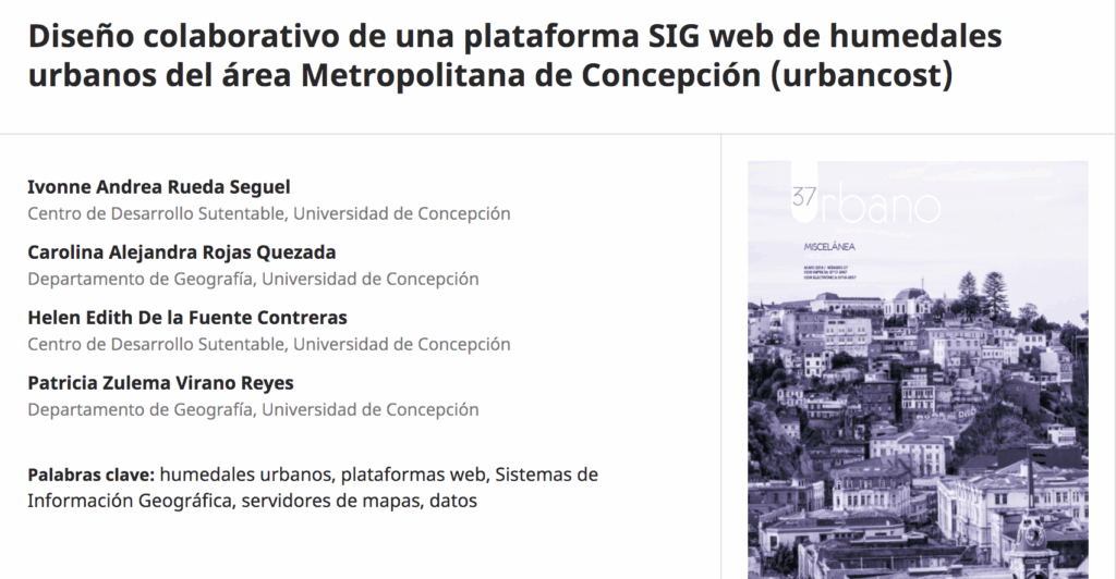 Se ha publicado en el último número de la Revista Urbano el artículo Diseño colaborativo de una plataforma SIG web de humedales urbanos del área metropolitana de Concepción (urbancost), de las autoras Ivonne Rueda, Carolina Rojas, Helen de la Fuente y Patricia Virano Resumen En el Área Metropolitana de Concepción existe una gran variedad de […]