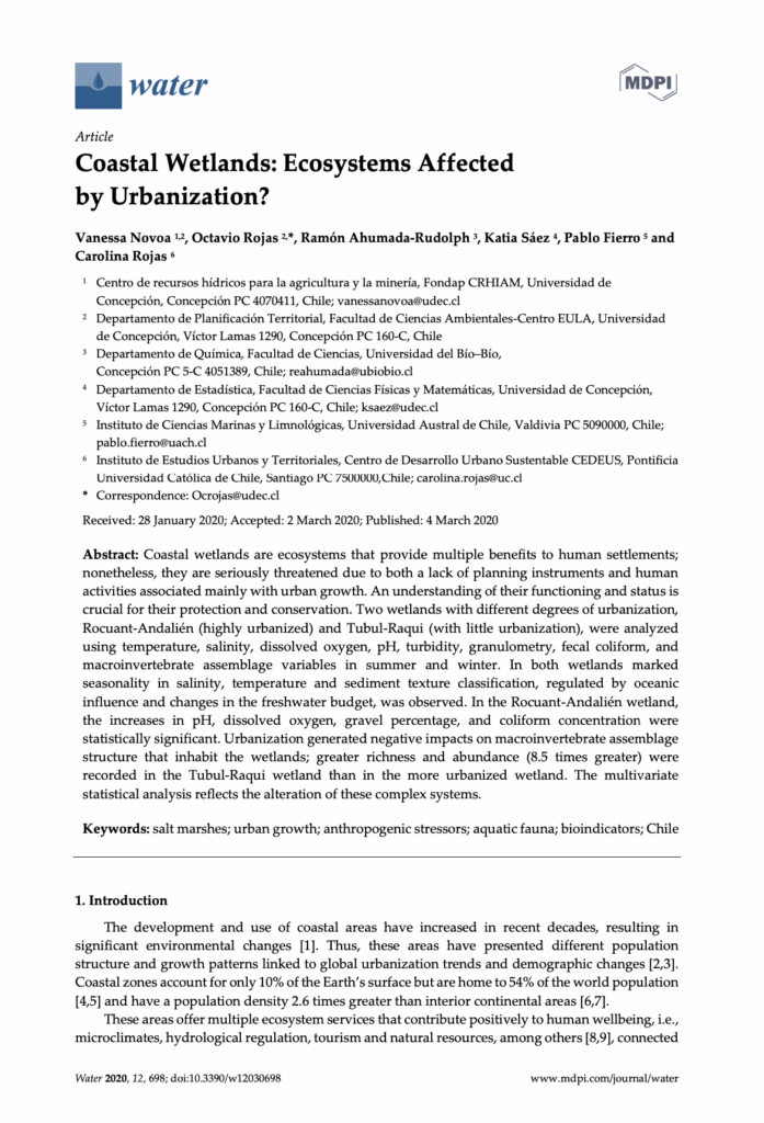 Novoa, V., Rojas, O., Ahumada-Rudolph, R., Sáez, K., Fierro, P., Rojas, C. (2020). Coastal Wetlands: Ecosystems Affected by Urbanization? Water 2020, 12, 698. Q1 Disponible en Water